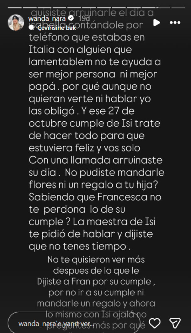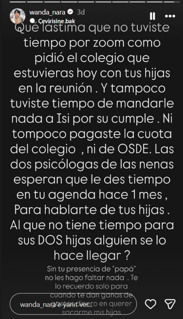 "KIZLARINA ZAMAN AYIRAMAYAN BİRİ" Wanda Nara paylaşımında; "Ne yazık ki bugün okulun istediği gibi kızlarınla toplantıya Zoom üzerinden katılacak zamanın olmadı. Ayrıca Isi'nin doğum günü için de hiçbir şey göndermedin. Ne okulun, ne de OSDE'nin ödemesini yaptın. Kızların psikologları, bir aydır seninle konuşmak için zaman bekliyor. Kızlarına zaman ayıramayan birine bunu kim iletecek? 'Baba' olarak senin yokluğunda onlardan hiçbir şey eksik etmiyorum. Bunu sadece, kızlarımı almaya para harcamak istediğinde hatırlaman için söylüyorum."