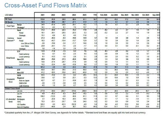 YILBAŞINDAN BU YANA 47 MİLYAR DOLAR Diğer tablo JP Morgan'ın gelişmekte olan ülkelere para akışını gösteren tablosu. Buna göre yılbaşından sonra 2 milyar dolarlık girişten bahsetsek bile 2025'te tüm gelişmekte olan ülke borsalarına 2025 yılı boyunca 29,2 milyar dolar net akım olduğu görülürken bu rakam 2026 başından şubatın ikinci haftasına kadar bakıldığında 47 milyar dolara ulaşmış durumda. Yani gelişmekte olan ülkelere çok güçlü bir akım olduğu görülüyor. Bu akımdan Borsa İstanbul'un da payını henüz yeni almaya başladığı anlaşılıyor.