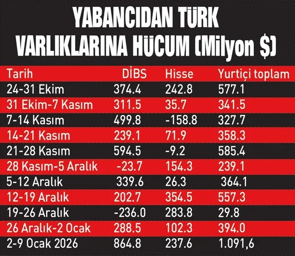 Borsa İstanbul'da geçen yıl 3 milyar 942 milyon dolarla son 13 yılın en yüksek net alımını yapan yabancıların ilgisi de kesintisiz sürüyor. Yabancılar 24 Ekim 2025- 9 Ocak 2026 tarihleri arasındaki 11 haftanın tamamında Türkiye'de kesintisiz net alım gerçekleştirdi. Bu denemde açılan pozisyonun büyüklüğü 4 milyar 865 milyon dolara ulaştı. Bu tutarın 3 milyar 455 milyon doları tahvil-bono, 1 milyar 341 milyon doları hisse senedi piyasasında gerçekleşti.