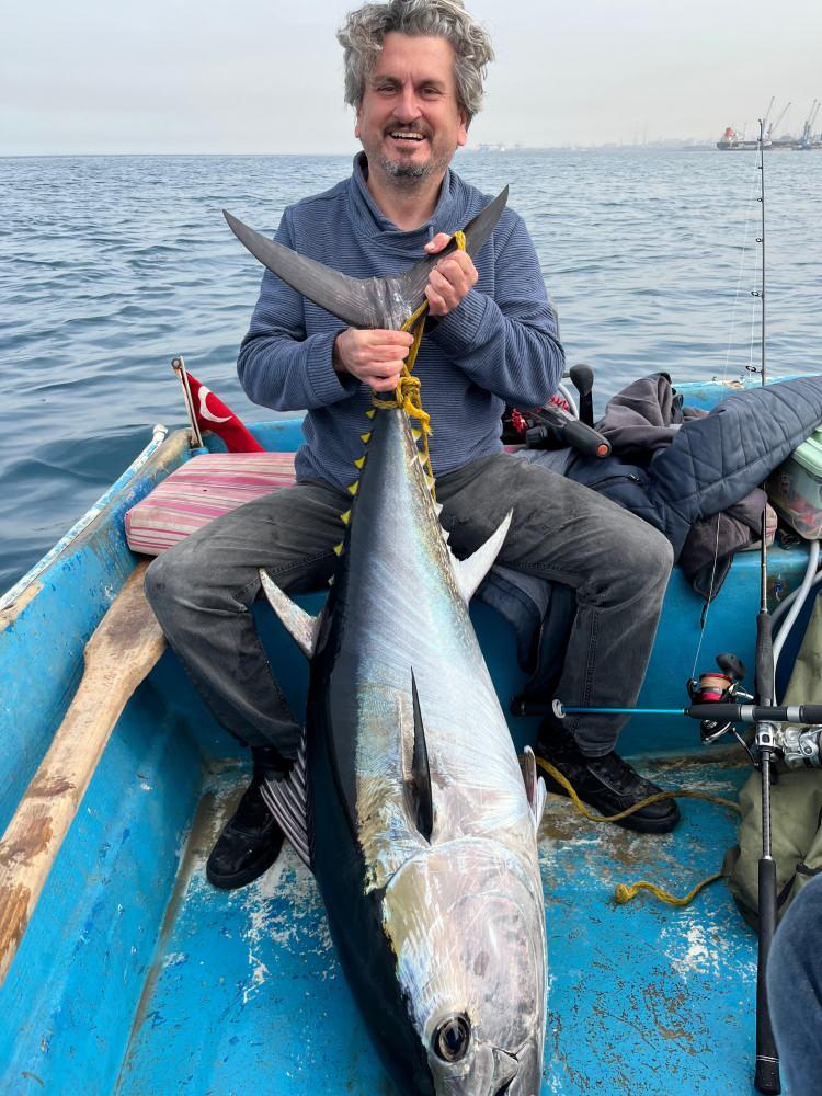 Hatay'da 2 saat süren mücadeleyle 60 kilogram ağırlığındaki ve bir buçuk metre uzunluğundaki Orkinos cinsi balığı yakalayan öğretmen Murat Çengel'in sevinci kursağında kaldı.