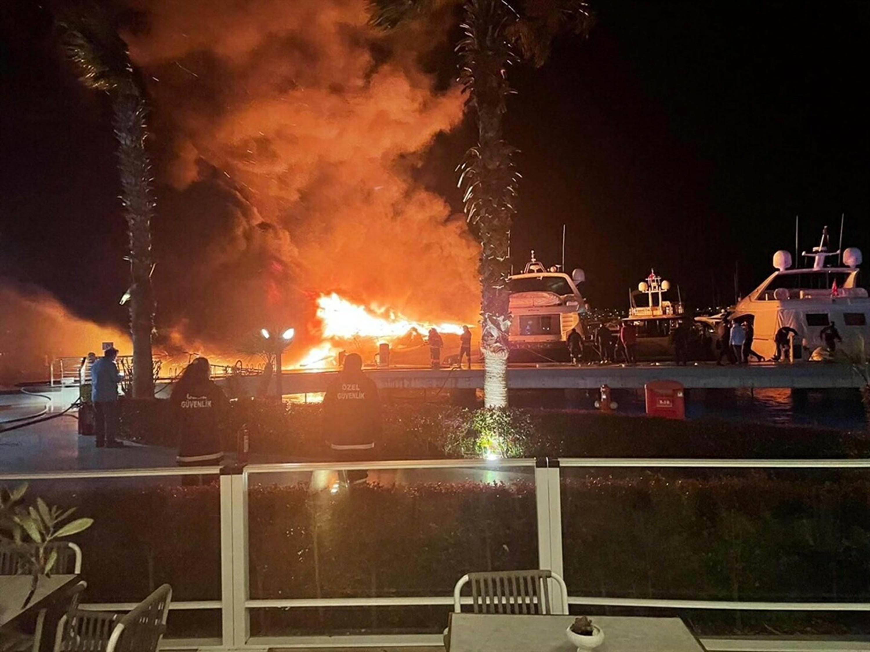 MİLYONLUK YATLAR ALEV ALEV YANDI!Çıkan yangında, boyları 20 ila 30 metre arasında değişen 'Sisu', 'Dadstoy', 'Sieasta', 'Floating Asset', 'Cher', 'İceberg' ve 'Lulu D Angel' isimli motoryatlar battı, 'Breeze' isimli motoryat hafif hasar aldı.