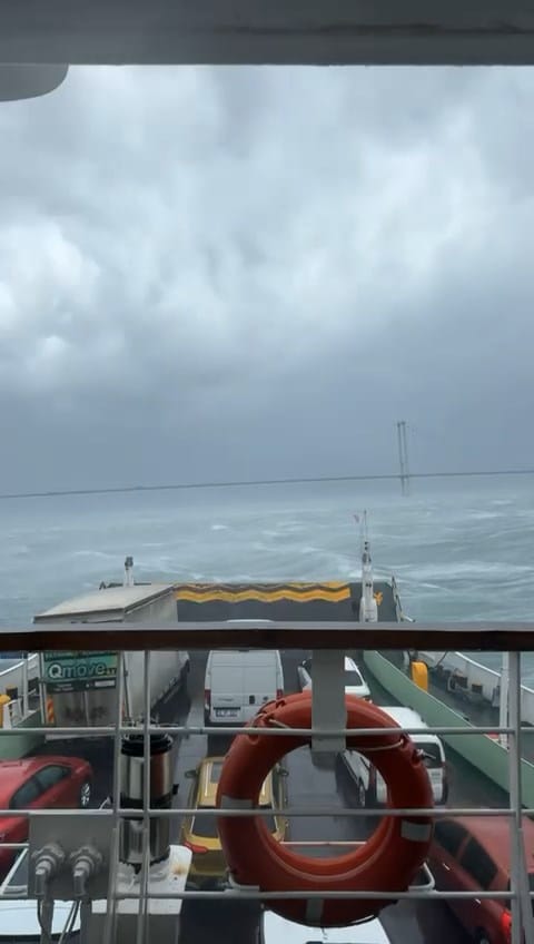 Eskihisar'dan sefere çıkan ve Yalova'ya giden bir arabalı feribot, Marmara'da sert şekilde etkili olan fırtınaya denizin ortasında yakalandı.