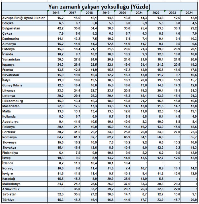Türkiye’de tam zamanlı çalışan yoksulluğu 2016 yılında yüzde 13,2 iken 2024 yılında yüzde 10,3’e gerilerken, yarı zamanlı çalışan yoksulluğu 2016 yılında yüzde 15,3 iken 2024 yılında yüzde 20,9’a tırmandı. AB üyesi ülkelerdeki genel eğilimin tersine Türkiye’de yarı zamanlı çalışan yoksulluğunun artması dikkat çekti.
