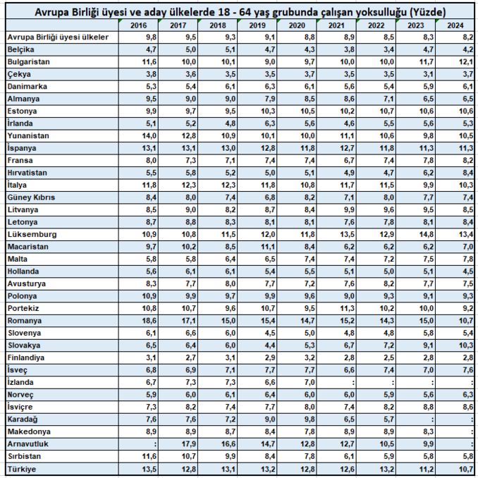 Türkiye’deki çalışan yoksulluğu ise 2016 yılında yüzde 13,5 iken 2022 yılına kadar dalgalı seyrettikten sonra 2023’te yüzde 11,2’ye, 2024’te ise yüzde 10,7’ye geriledi.