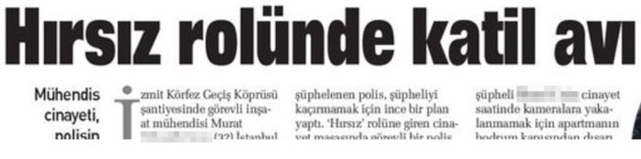 İŞE GİDERKEN SALDIRIYA UĞRADI Elde edilen bilgilere göre maktul, İzmit Körfez’de bir inşaatta çalışan mühendisti. Henüz 5 aylık evliydi. O sabah da her zamanki gibi saat 05.45 sıralarında işe gitmek için evden çıktı. Ancak apartmanın merdiven boşluğunda bıçaklı saldırıya uğradı. Olay yerinde inceleme yapan polis ekipleri ilk etapta iki ihtimal üzerinde durdu. Birinci ihtimale göre olay planlanmış bir cinayet olabilirdi. İkinci ihtimal ise Murat Bey’in evden çıktığı sırada apartman içinde bir hırsız ya da hırsızlarla karşılaşmış olabileceğiydi. Bu ihtimale göre şüpheliler, karşılaştıkları Murat Bey’i bıçaklayarak olay yerinden kaçmış olabilirdi. Cinayet dedektifleri için artık cevaplanması gereken önemli sorular vardı.