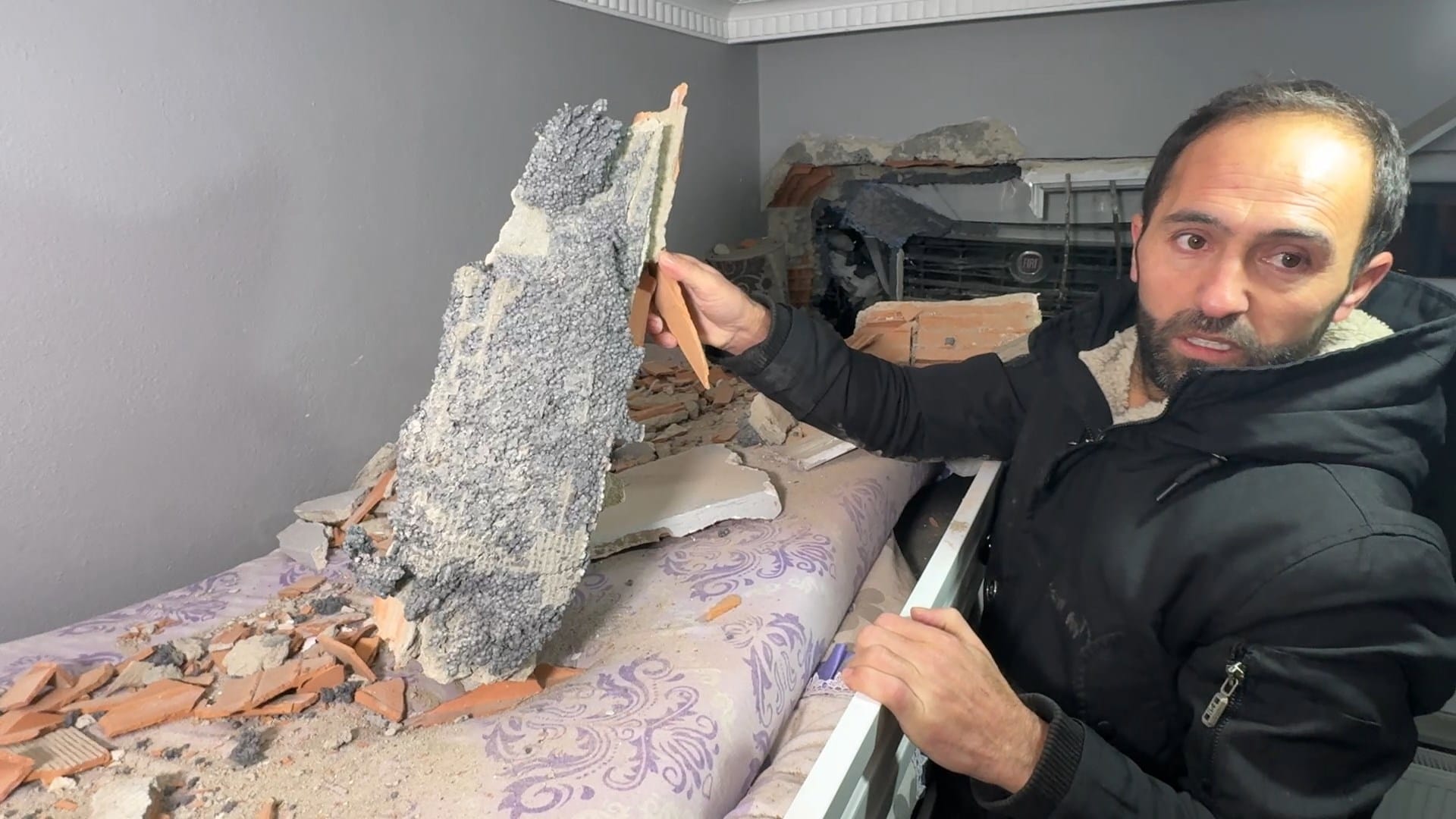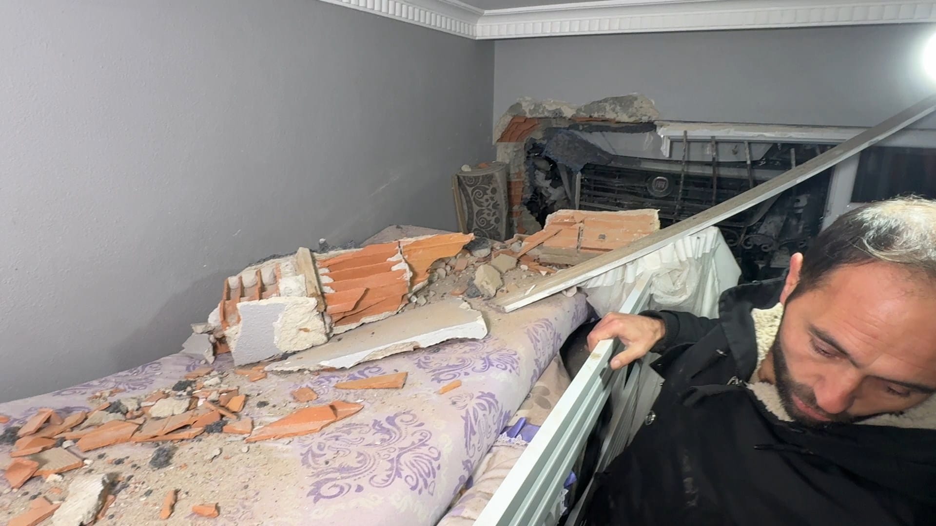 YASTIĞIN YANINA DÜŞEN BETON PARÇALARIÇarpmanın etkisiyle odanın duvarından kopan tuğla ve beton bloklar, o sırada ranzada bulunan iki çocuğun yatağının üzerine yağdı. Olayın şokunu yaşayan çocuklar, fiziksel bir yara almadan yataklarından fırlayarak ailelerinin yanına koştu.
