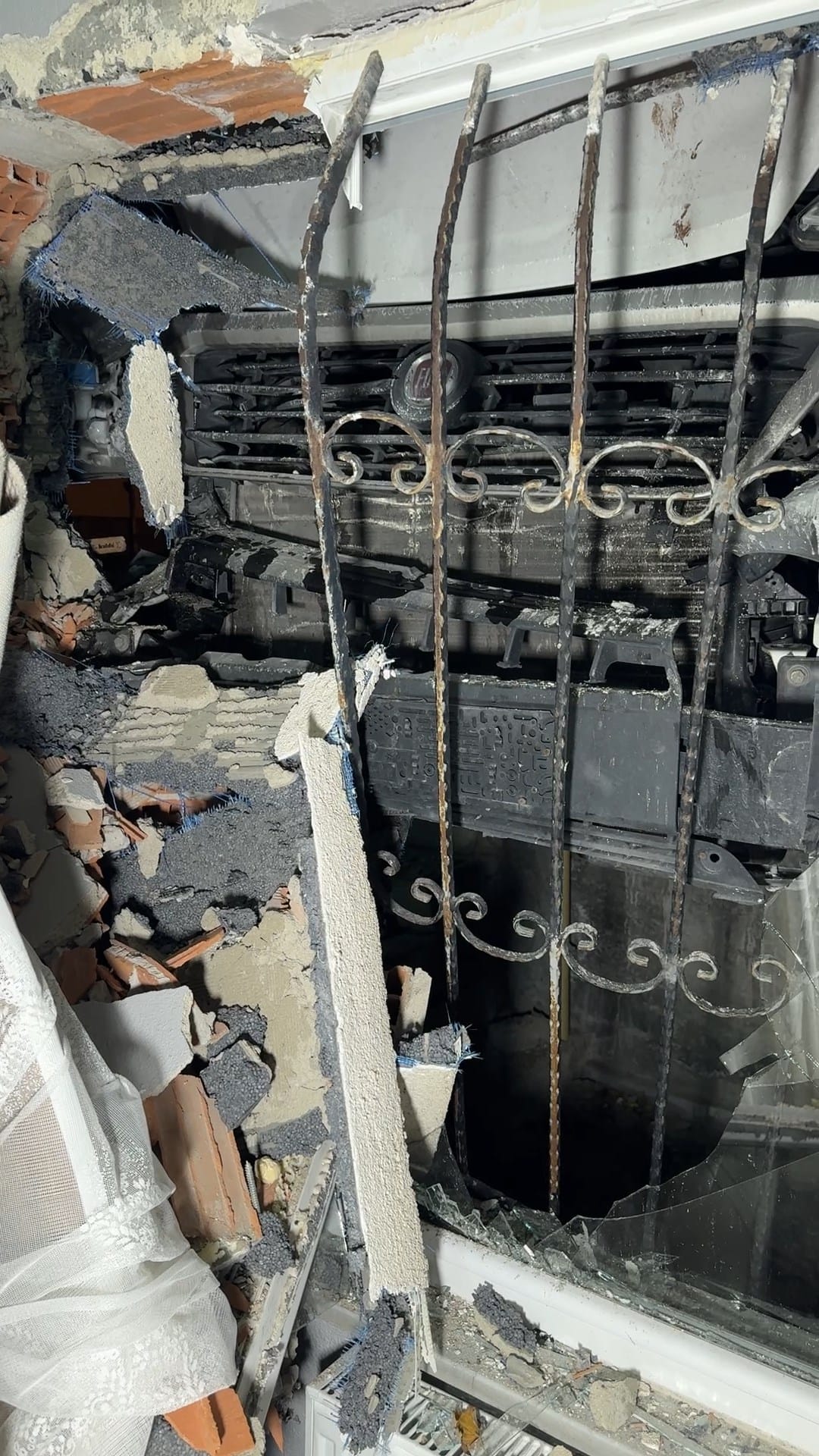 Hız kazanan araç, sokağın sonunda yer alan Emrah Taneri’ye ait binanın giriş katına çarparak durabildi. Ancak çarpışmanın kinetik enerjisi, binanın dış duvarını yıkarak aracın ön kısmının kısmen evin içine girmesine neden oldu.