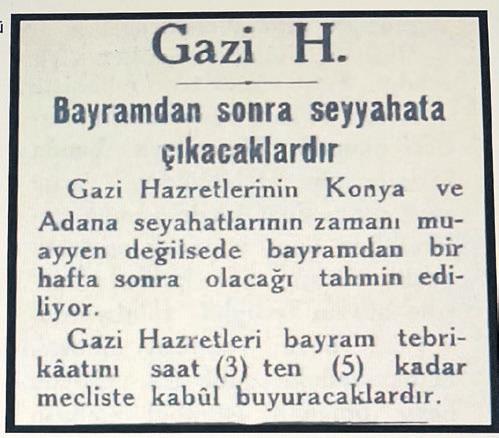 "Cumhurbaşkanı Mustafa Kemal Paşa Hazretleri, saat 15.00-16.00 arasında Türkiye Büyük Millet Meclisi'nde olacak... Ve Ramazan Bayramı tebriklerini kabul edecek."