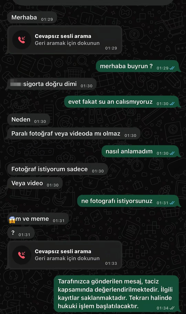 "MESAJLAR TACİZ KAPSAMINDA"Kadın sigortacı, son mesajında gönderilen ifadelerin taciz kapsamında değerlendirildiğini belirterek ilgili kayıtların saklandığını ve benzer durumun tekrarlanması halinde hukuki işlem başlatılacağını bildirdi.