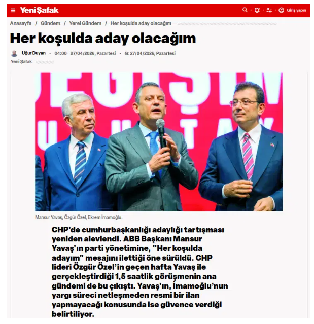 İktidara yakınlığıyla bilinen Yeni Şafak, "Her koşulda aday olacağım" başlıklı haberinde "CHP'de cumhurbaşkanlığı adaylığı tartışması yeniden alevlendi" diyerek "ABB Başkanı Mansur Yavaş'ın parti yönetimine, 'Her koşulda adayım' mesajını ilettiği öne sürüldü" ifadelerini kullandı.