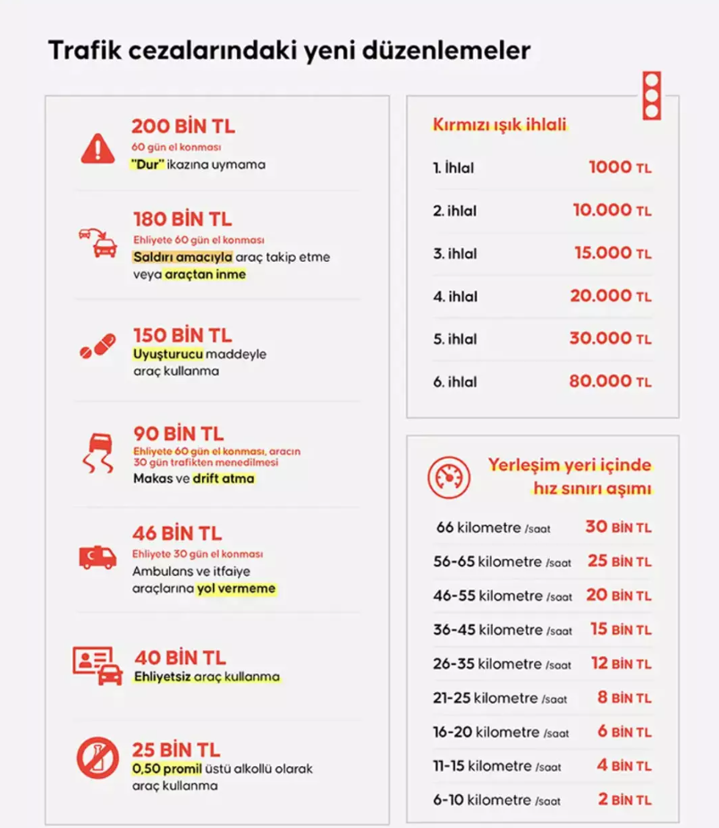 KIRMIZI IŞIK İHLALİNDE CEZA KATLANIYORKırmızı ışık ihlali yapan sürücüler 1000 lira ceza ödeyecek. Aynı ihlalin bir yıl içinde tekrarlanması halinde ceza kademeli olarak artacak ve altıncı ihlalde 80 bin liraya kadar çıkabilecek.