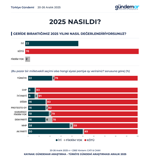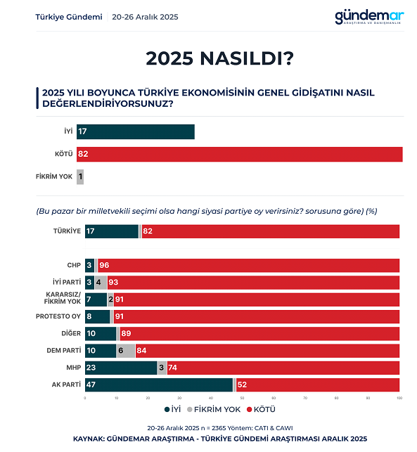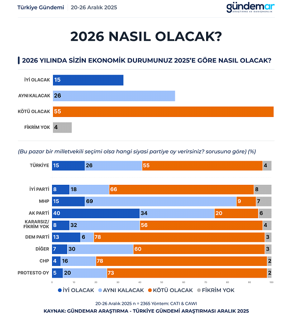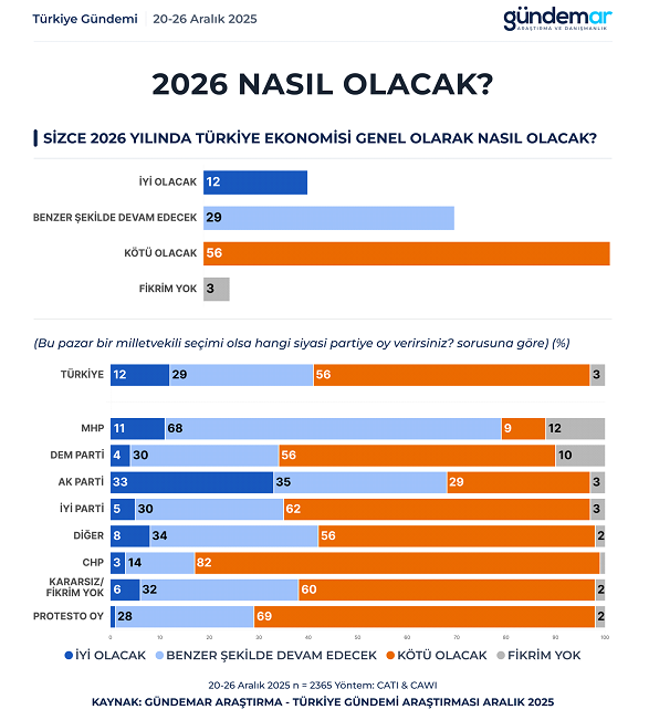 20-26Aralık 2025 tarihleri arasında Türkiye genelindeki 60 ilini kapsayan ve örneklem büyüklüğü 2.365 kişiden oluşan araştırma sonuçlarına göre, Vatandaşın yüzde 29'u 2026'ın 2025 yılı gibi benzer şekilde devam edeceğine inanırken, "kötü olacak" diyenlerin oranı yüzde 56 oldu.
