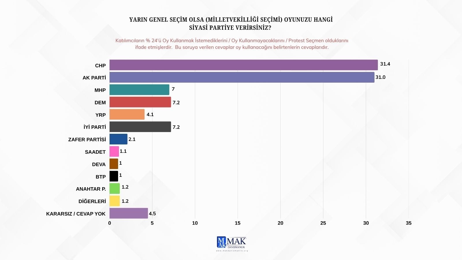 AKP diyenlerin oranı yüzde 31 olurken; İYİ Parti diyenlerin oranı yüzde 7,2 ve DEM diyenlerin oranı da yüzde 7,2 oldu.