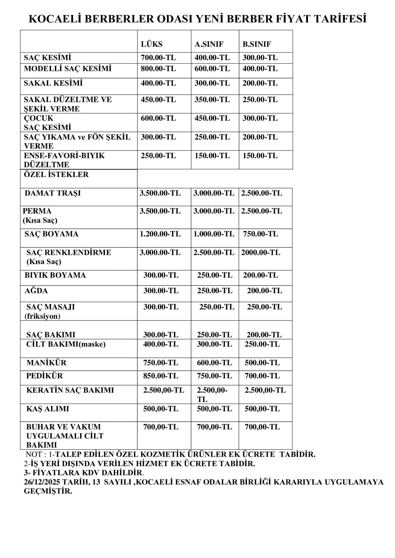 Kocaeli Berberler Odası tarafından belirlenen yeni berber fiyat tarifesi yürürlüğe girdi. Kocaeli Esnaf Odaları Birliği’nin kararıyla onaylanan tarife; lüks, A sınıfı ve B sınıfı işletmeler için ayrı ayrı belirlendi. Fiyatlara KDV dahil edilirken, talep edilen özel kozmetik ürünler ile iş yeri dışında verilen hizmetlerin ek ücrete tabi olacağı bildirildi. Kocaeli Berberler Esnaf ve Sanatkarlar Odası Başkanı Mustafa Bozkurt, il genelindeki tüm ilçelerde yeni tarifelerin Ocak 2026 itibarıyla eş zamanlı olarak yürürlüğe gireceğini duyurarak tarifeleri açıkladı.