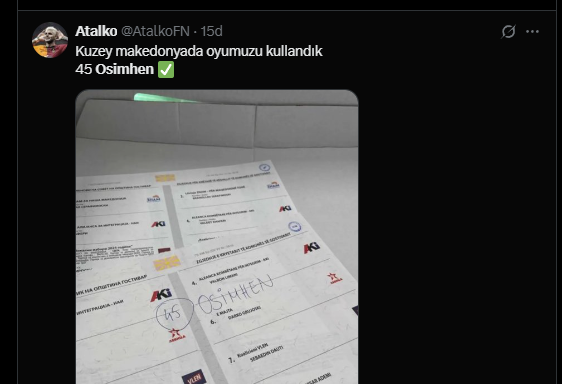 "OSIMHEN 45"Vardarpress’in haberine göre, söz konusu seçmen oyunu kurşun kalemle "Osimhen 45" yazarak kullandı. Her ne kadar geçerli sayılmasa da bu jest, sosyal medyada hızla yayıldı ve futbolseverlerin ilgisini çekti.