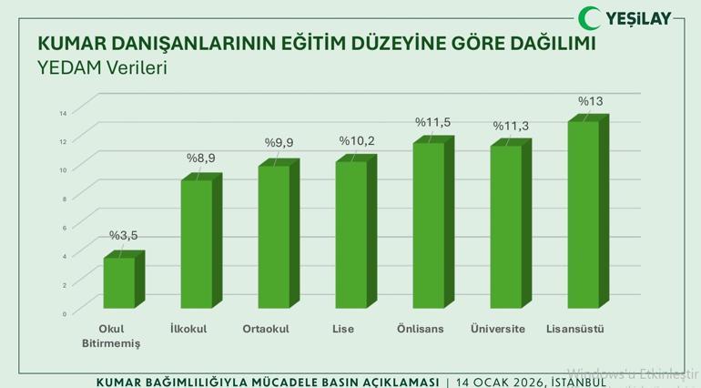 Doç. Dr. Dinç, "Yüzde 13’ü lisansüstü bize gelen danışanların. Yüzde 11’i üniversite mezunu, lisans mezunu. Yüzde 11’i ön lisans mezunu. Yüzde 10’u lise mezunu, yüzde 9’u ortaokul mezunu, yüzde 8’i ilkokul mezunu, yüzde 3’ü okul bitirmemiş durumda. Normalde eğitimle beraber bağımlılığın azalmasını bekleriz ama burada tam tersi bir çerçeve söz konusu. En yüksek rakam lisansüstü, üniversitenin üzerine yüksek lisans yapmış, doktora yapmış insanımızda olduğunu görüyoruz" dedi.
