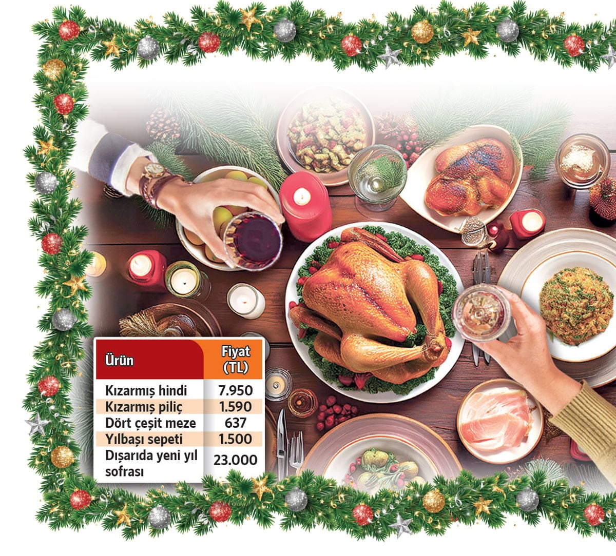 Geçen yıl 8.619 TL’ye kurulan yeni yıl sofrasının maliyeti bu yıl yine içki seçeneği de eklenince 12 bin TL’yi buluyor. Ortalama 4-6 kişilik bir sofrada hindi, meze, alkollü içecekler ve kuruyemiş gibi ürünlerin olması halinde ortalamada 12.000 TL’lik bir fatura ortaya çıkıyor.