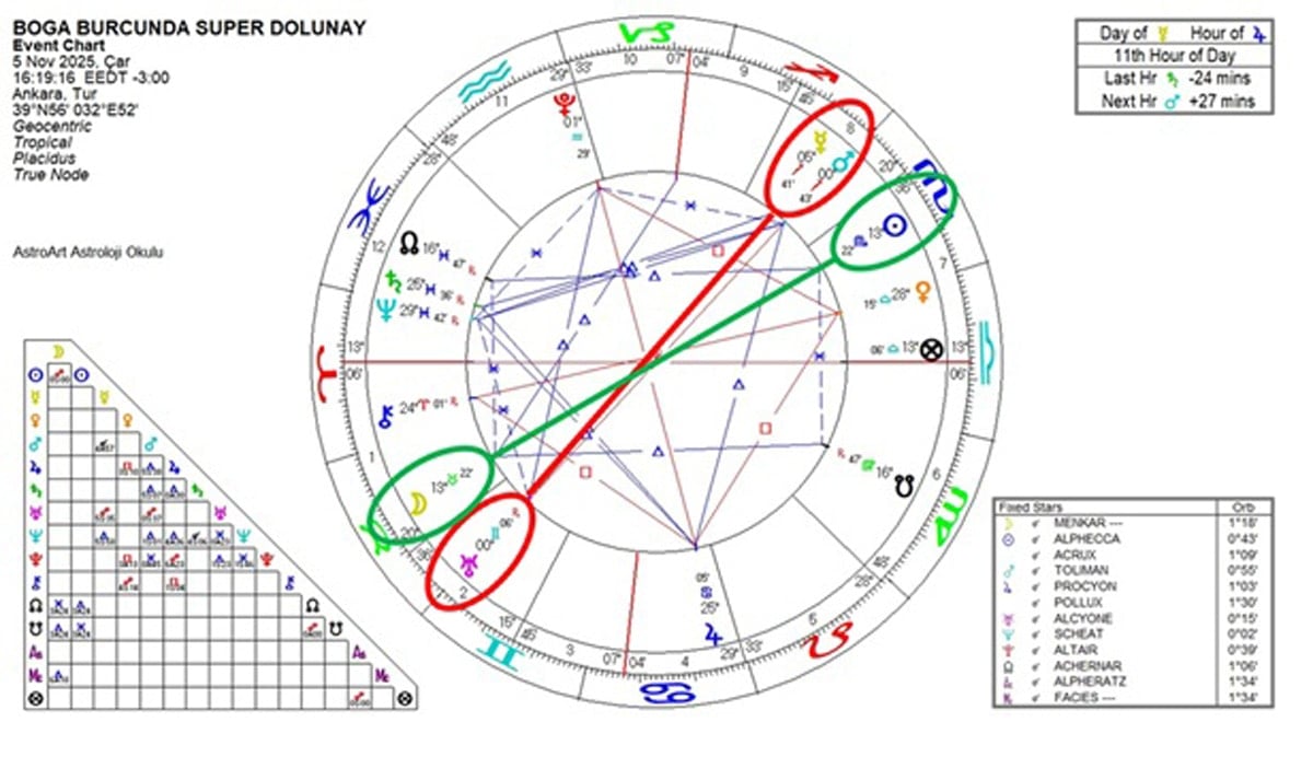 5 Kasım’da Boğa burcunda gerçekleşecek dolunay Ay’ın bu yıl Dünya’ya en yakın noktasındayken gerçekleşen bir SÜPERAY. Ay’ın yörüngesinde Dünya’ya en yakın geçişini yaptığı sırada gerçekleşen bir yeniaya veya dolunaya süperay denir. Böylesi dönemlerde Ay normalden daha parlak ve büyük gözükür. Tabii ki bizler üzerinde de daha fazla etki yaratır. Aşağıda dolunayın astroloji haritasını görmektesiniz.