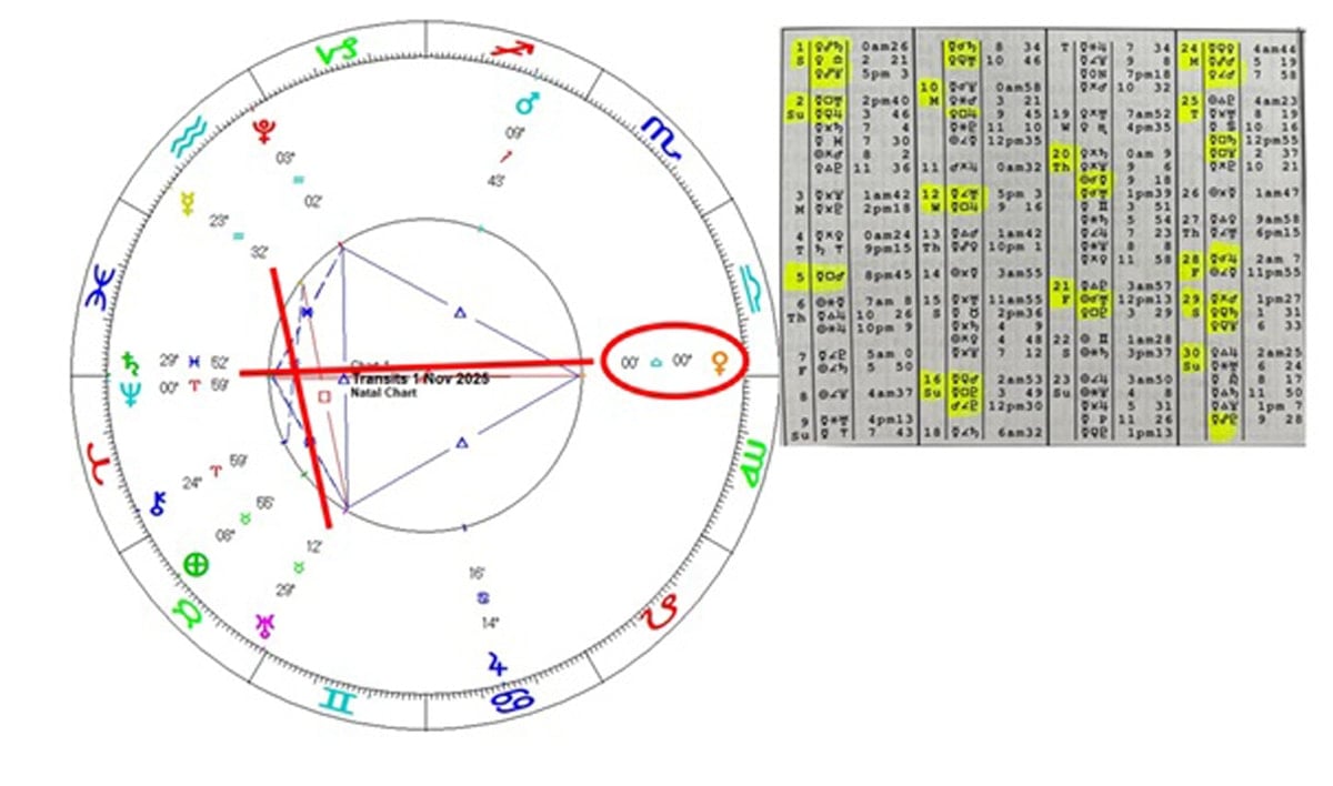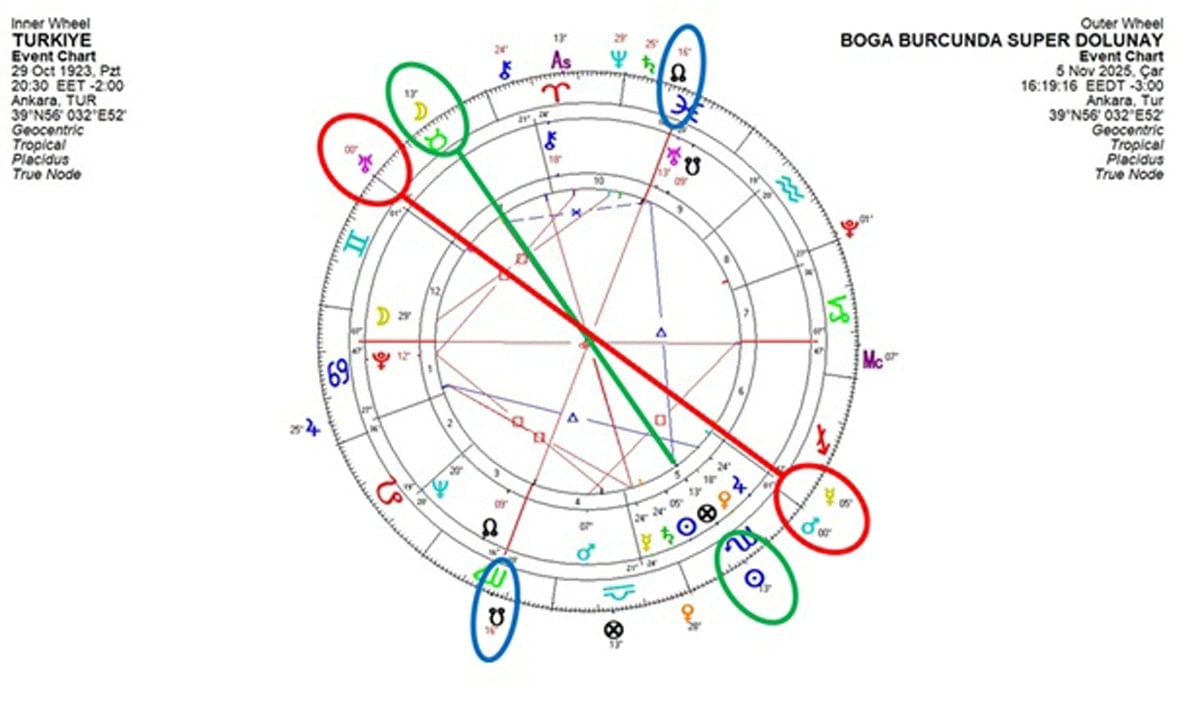 1 Kasım’da Venüs’ün Satürn ve Neptün ile hizalanması dikkat çekiyor. 2 Kasım’da Merkür-Uranüs arasındaki dik açı elektromanyetik alanda türbülans ihtimalini akla getiriyor. Sismik aktivitede artışı da beraberinde getirebilir. 5 Kasım’daki Merkür-Mars karesi sert söylemlere ve şiddetli olaylara işaret ediyor. 6 Kasım’da kesinleşecek Merkür-Jüpiter üçgeniyse önemli bilgilerin paylaşımlarının yoğunlaşacağını gösteriyor.