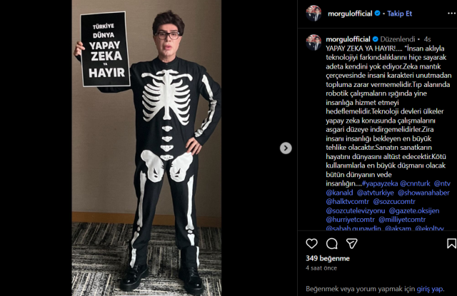 İskelet desenli bir kostümle kameranın karşısına geçen sanatçı, elinde "Türkiye- Dünya Yapay Zekâya Hayır" yazılı bir pankart tuttuğu fotoğrafını sosyal medya hesabından paylaştı. Morgül, paylaşımının düştüğü notta ise yapay zekânın kontrolsüz gelişiminin insanlığı tehdit ettiğini savundu.