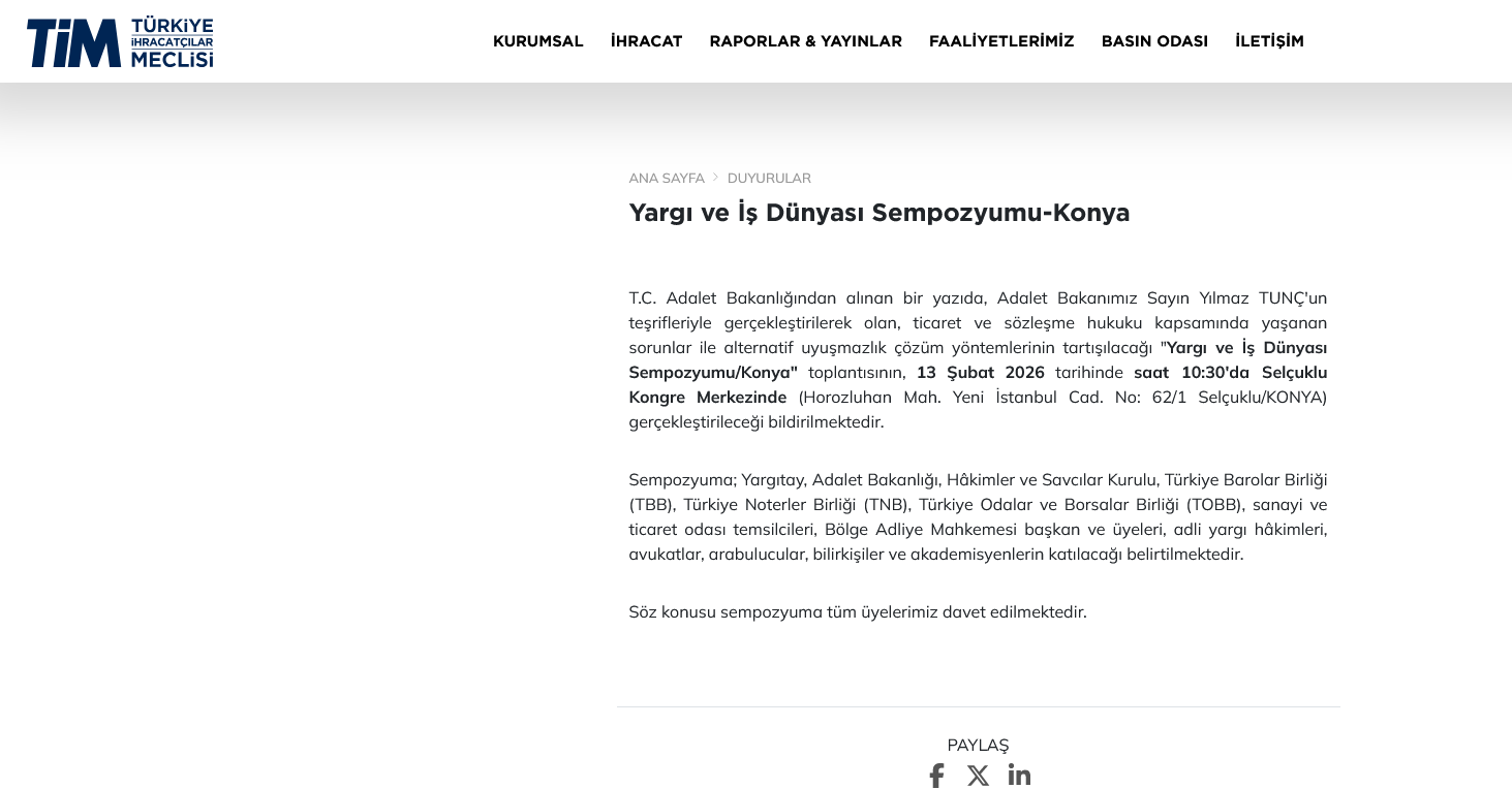 "T.C. Adalet Bakanlığından alınan bir yazıda, Adalet Bakanımız Sayın Yılmaz TUNÇ'un teşrifleriyle gerçekleştirilerek olan, ticaret ve sözleşme hukuku kapsamında yaşanan sorunlar ile alternatif uyuşmazlık çözüm yöntemlerinin tartışılacağı "Yargı ve İş Dünyası Sempozyumu/Konya" toplantısının, 13 Şubat 2026 tarihinde saat 10:30'da Selçuklu Kongre Merkezinde (Horozluhan Mah. Yeni İstanbul Cad. No: 62/1 Selçuklu/KONYA) gerçekleştirileceği bildirilmektedir.