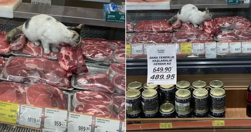 MİDE BULANDIRAN GÖRÜNTÜLERZincir markette bir müşteri, şarküteri reyonunda etlerin üzerinde dolaşan ve koca bir et parçasını yemeye çalışan bir kediyi görüntüledi. Cihan Güneş isimli kullanıcı sosyal medya hesabından paylaşım yaparak "Kapıda güvenlik ve içeride personeller olduğu halde bu gördüğüm görüntü. Bu olayın tarihi ve saati bellidir. Gerekli yerlere şikayet edeceğim. Böyle bir şey kabul edilemez." diyerek durumu tepki gösterdi.