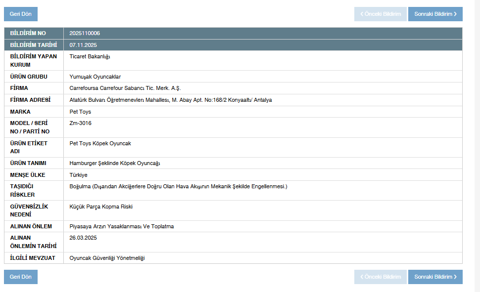 SATIŞ YAPAN FİRMA VE ALINAN ÖNLEMLERRiskli ürünün Türkiye’de satışı, CarrefourSA Carrefour Sabancı Ticaret Merkezi A.Ş. tarafından yapılıyordu. Bakanlık, 26 Mart 2025 tarihinde alınan önlem kapsamında, söz konusu oyuncağın piyasadan arzının yasaklanmasına ve toplatılmasına karar verdi.
