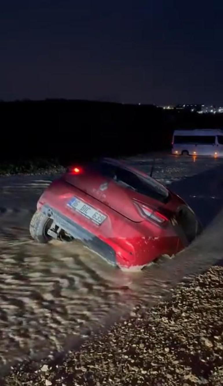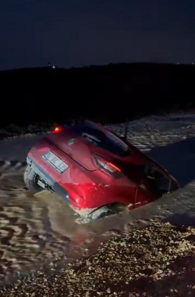 Yol çalışmasındaki çamura saplanan otomobilin sürücüsü son anda kurtuldu; o anlar kamerada
