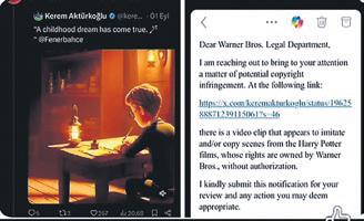 "Olası bir telif hakkı ihlali konusunu dikkatinize sunmak için yazıyorum. Aşağıdaki bağlantıda yer alan bu bölüm, Kerem Aktürkoğlu'nun Harry Potter filmlerinden bir diziyi taklit etmek ve/veya kopyalamak için kullandığı bir video kliptir ve hakları Warner Bross.'a aittir. Bu bildirimi incelemeniz ve uygun gördüğünüz her türlü işlem için göndermenizi rica ediyorum."