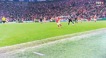Galatasaray'ın üçüncü golünün hemen ardından aynı sorun tekrarlandı. Bu kez yayın, pilot kamerada fikslendi. Ne golün tekrarı ne de yakın çekimler ekrana gelebildi.