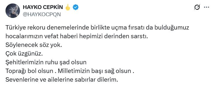 "Türkiye rekoru denemelerinde birlikte uçma fırsatı da bulduğumuz hocalarımızın vefat haberi hepimizi derinden sarstı. Söylenecek söz yok. Çok üzgünüz. Şehitlerimizin ruhu şad olsun Toprağı bol olsun . Milletimizin başı sağ olsun . Sevenlerine ve ailelerine sabırlar dilerim."