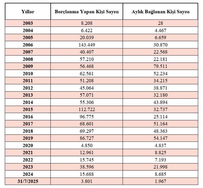 2019 yılında yurt dışı borçlanmasında prim oranının yüzde 32’den 45’e çıkartılmasının etkisiyle başvurular 2020 yılında 5 binin altına geriledi. Emeklilikte yaşa takılanlar (EYT) düzenlemesi dolayısıyla 2023 yılındaki başvurular tekrar 40 bine yaklaştı ise de 2024 yılında 15.688’e, bu yılın 7 aylık döneminde de 3.801’e geriledi.