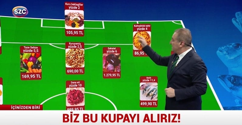 - Orta sahada sol açığım. Sucuk, şarküteri ürünleri bir kilosu Bin 700 lira. Taze fasulye fiyatı 170 lira. Sakatatta ise bir kilo kuzu ciğeri Bin 280 lira. Sağ açığımız meşrubat. Bir litre kola 64 liralarda market fiyatı.