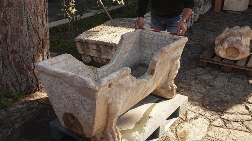 "Ekibimiz, küvetin bir çeşme yalağı olarak devşirildiğini tespit etti. Normalde kırıkların, kesiklerin bulunmaması gerekirken küvetin formu değiştirildiği, üstten suyun girişi ve alttan çıkışı için iki delik açıldığını görüyoruz."