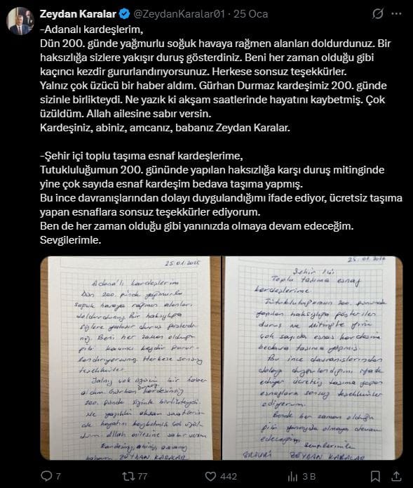 Tutuklu Adana Belediye Başkanı Zeydan Karalar'ın X paylaşımı (25 Ocak 2026)