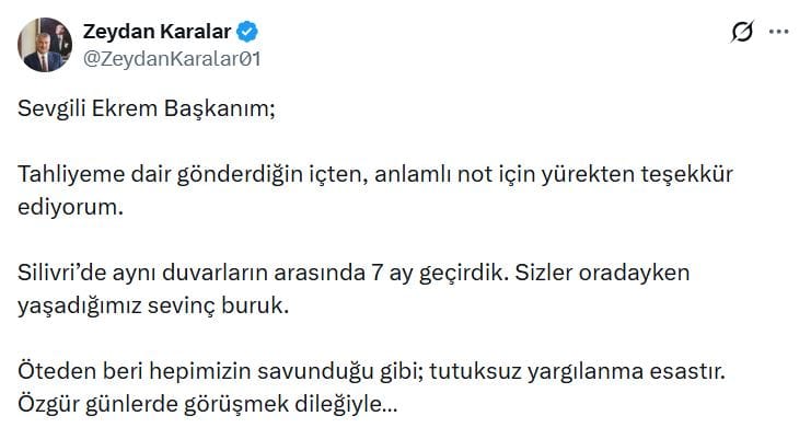 "Sevgili Ekrem Başkanım; Tahliyeme dair gönderdiğin içten, anlamlı not için yürekten teşekkür ediyorum. Silivri’de aynı duvarların arasında 7 ay geçirdik. Sizler oradayken yaşadığımız sevinç buruk. Öteden beri hepimizin savunduğu gibi; tutuksuz yargılanma esastır. Özgür günlerde görüşmek dileğiyle…"
