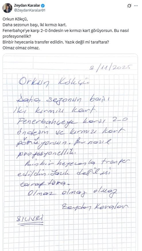 CHP'li tutuklu Adana Büyükşehir Belediye Başkanı Zeydan Karalar, Fenerbahçe derbisinde kırmızı kart gören Beşiktaşlı futbolcu Orkun Kökçü'ye sitem dolu bir mektup yazdı.