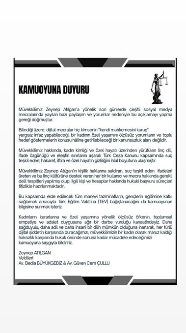 "LİNÇ DİLİ, İFTİRA VE ÖZEL HAYATIN GİZLİLİĞİNİ İHLAL BOYUTUNA ULAŞMIŞTIR" Müvekkilimiz hakkında, kadın kimliği ve özel hayatı üzerinden yürütülen linç dili; ifade özgürlüğü ve eleştiri sınırlarını aşarak Türk Ceza Kanunu kapsamında suç teşkil eden hakaret, iftira ve özel hayatın gizliliğini ihlal boyutuna ulaşmıştır. Müvekkilimiz Zeynep Atılgan’ın kişilik haklarına saldıran, suç teşkil eden ifadeleri üreten ve bu linç kültürüne destek veren her bir kullanıcı ve mecra hakkında gerekli delil tespitleri yapılmış olup; ilgili kişi ve hesaplar hakkında hukuki başvuru süreçleri titizlikle hazırlanmaktadır. Bu kapsamda elde edilecek tüm manevi tazminatların, gençlerin eğitimine katkı sağlamak amacıyla Türk Eğitim Vakfı'na bağışlanacağını da kamuoyunun bilgisine sunmak isteriz.