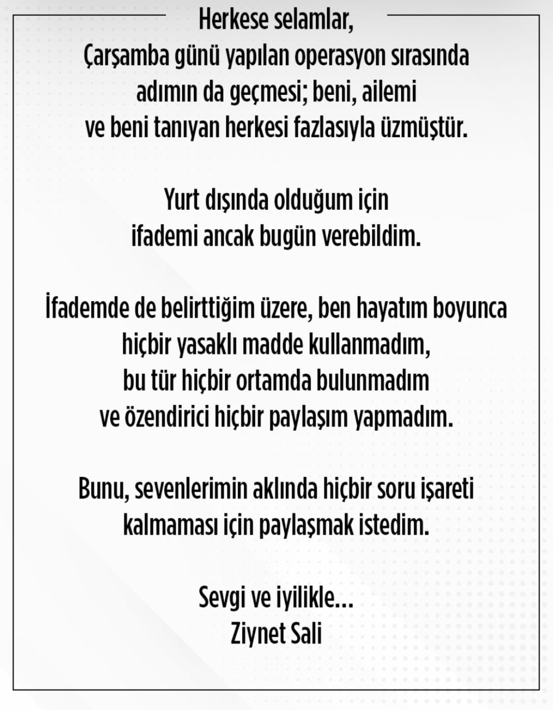 ZİYNET SALİ'NİN SOSYAL MEDYA HESABINDAN YAPTIĞI AÇIKLAMASali'nin sosyal medya hesabından yaptığı açıklama şu şekilde: